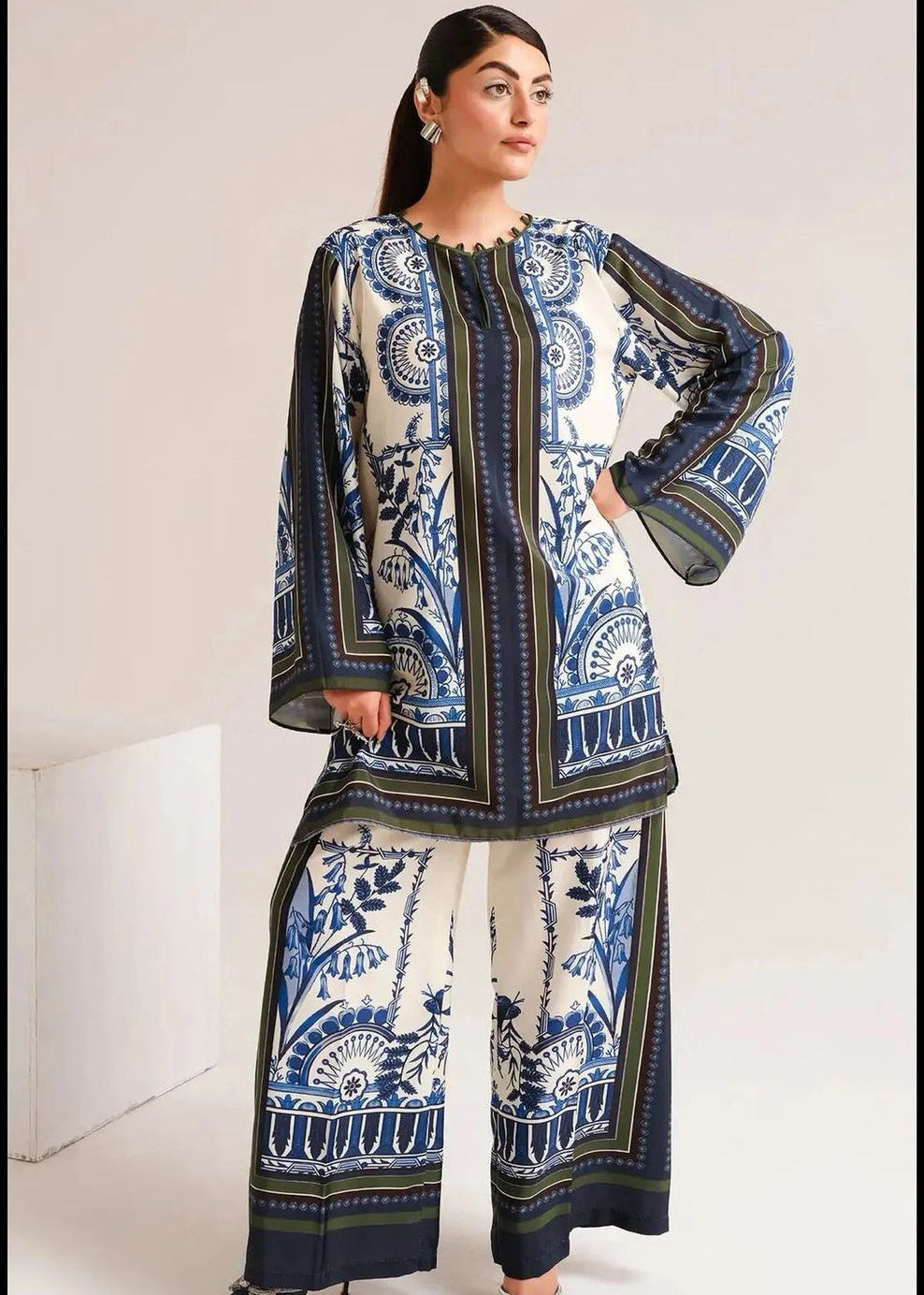 Step into elegance with this statement luxury co-ord set featuring rich blue and ivory prints inspired by Mughal motifs. Crafted from a soft, flowy silk-feel fabric, this 2-piece outfit includes a long straight kurta and wide-leg palazzo pants, making it perfect for festive gatherings, formal dinners, or stylish everyday wear.