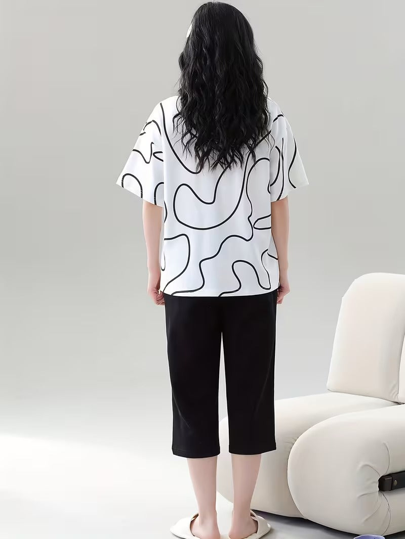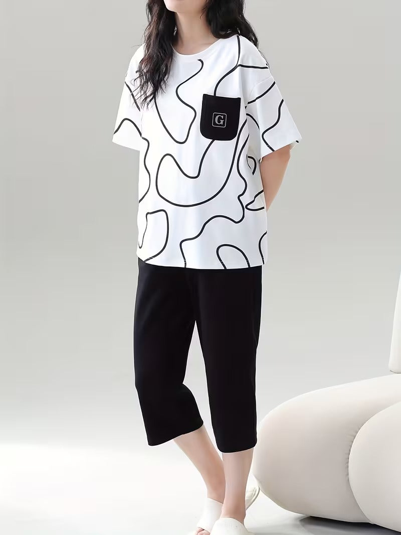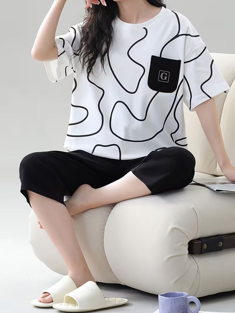 White Black Lining Pocket Printed Half Sleeves Pajama Sets