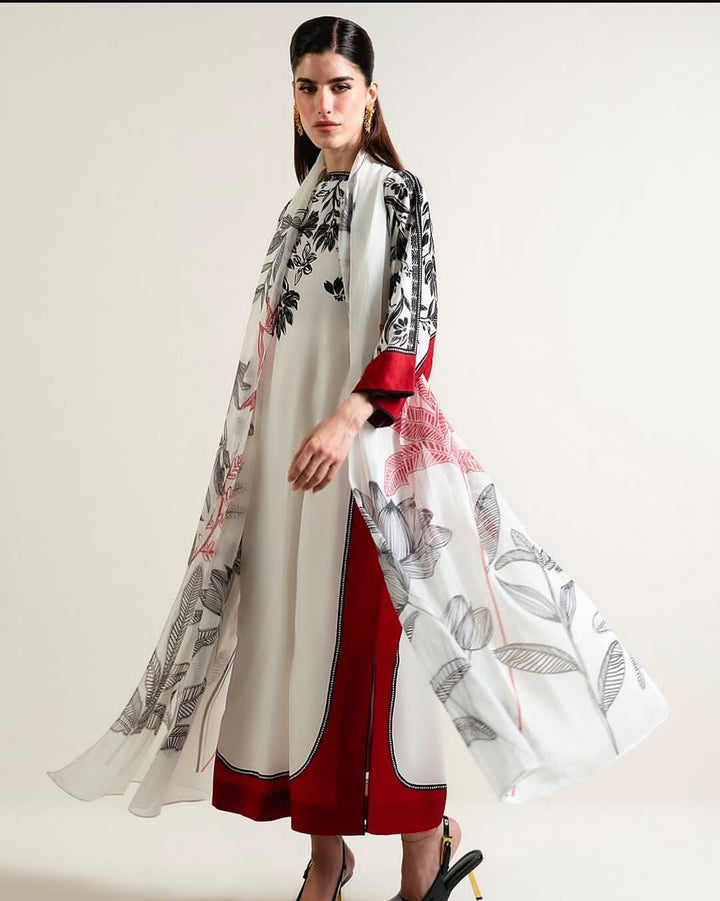 White shirt with red troser and printted crinkle georget dubatta. -