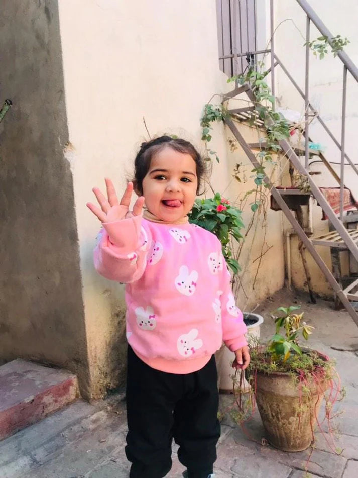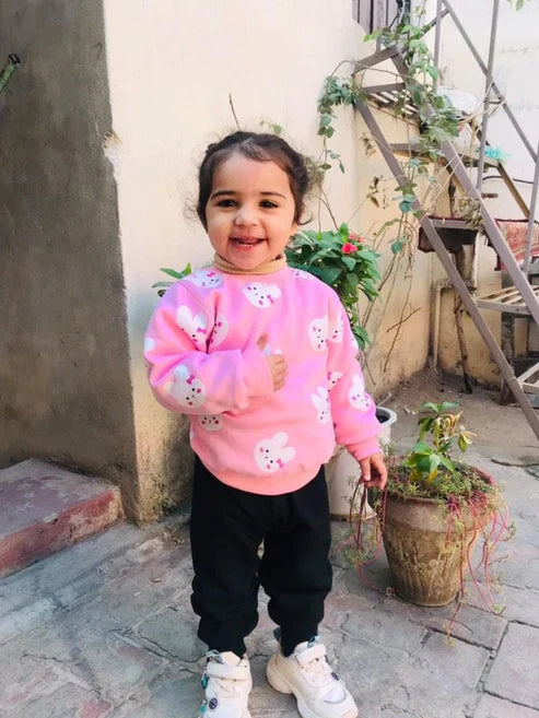 The Light Baby-pink sweatshirt features charming white bunny faces with rosy cheeks — making it irresistibly cute and full of playful vibes. Paired with soft black fleece trousers, this outfit offers both comfort and coziness for chilly days.
