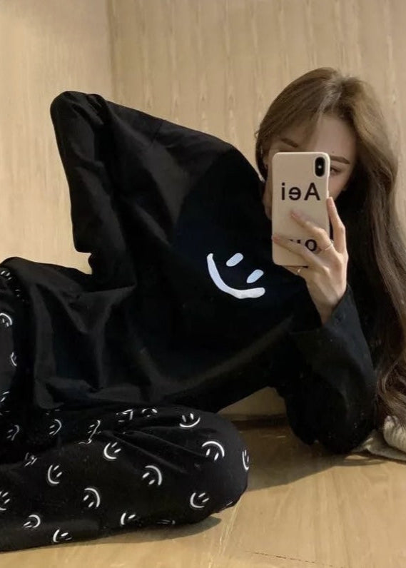 Stay cozy and stylish at home with our Black Smiley Face Pajama Set. Featuring an oversized black long-sleeve top with a cute smiley design and matching black pajama pants with all-over smiley prints, this set is perfect for lounging, sleeping, or lazy weekend mornings.