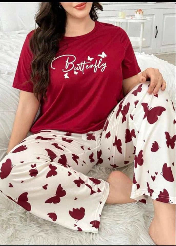 Add a touch of elegance and comfort to your night routine with our Butterfly Print Maroon & White Pajama Set. Featuring a soft maroon short-sleeve top with “Butterfly” print and matching white pajama pants adorned with bold maroon butterflies, this set is perfect for cozy nights and relaxing mornings.