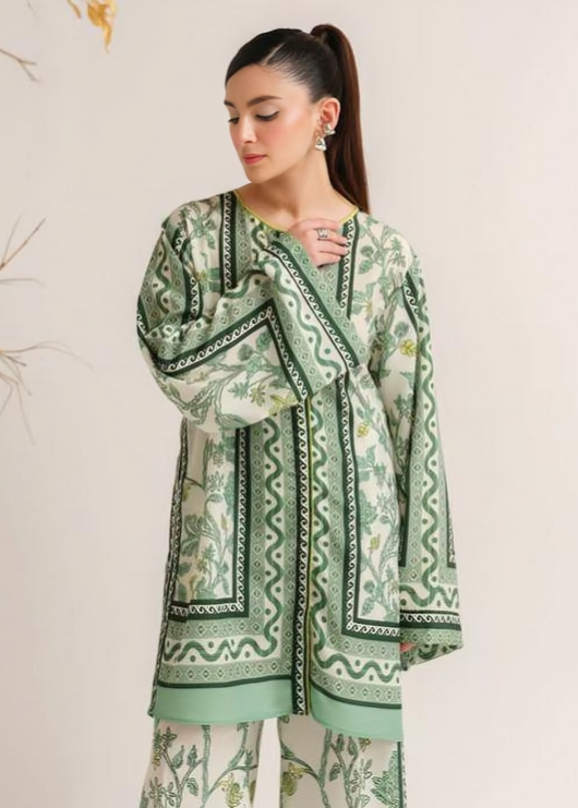 Elevate your wardrobe with this stunning Two-Piece Lawn Suit, designed for the modern woman who values elegance and comfort. This ensemble features a beautifully crafted shirt adorned with intricate geometric and floral patterns, paired with matching trousers that perfectly complement the design.
