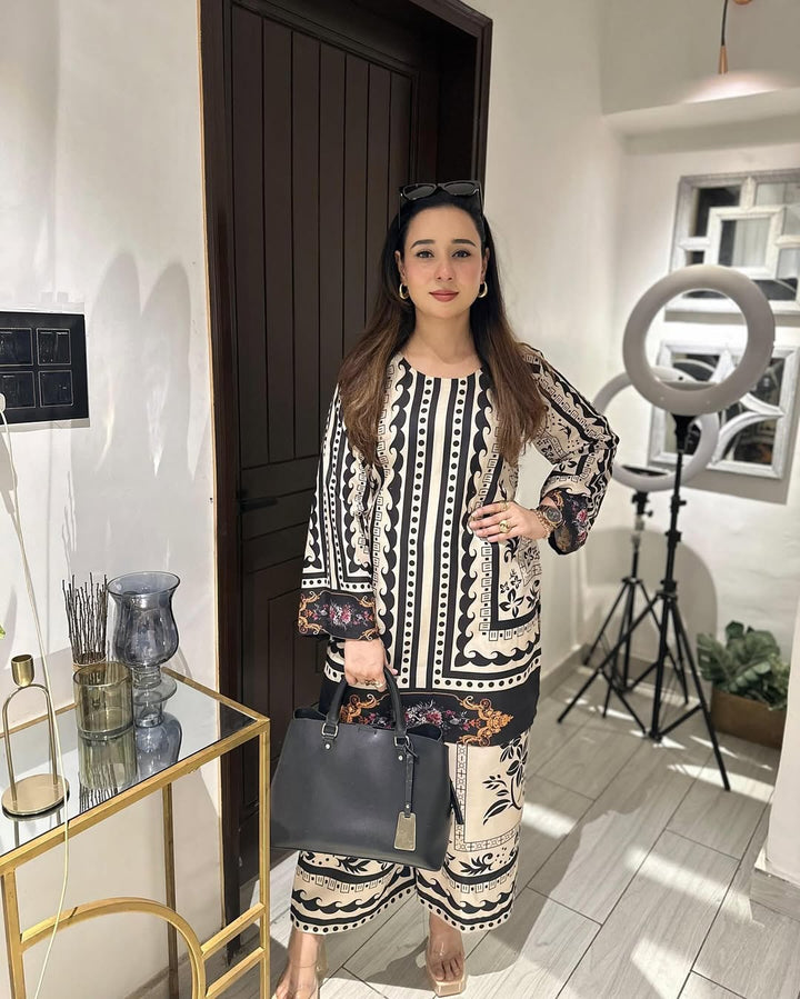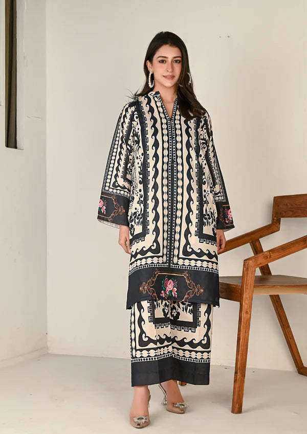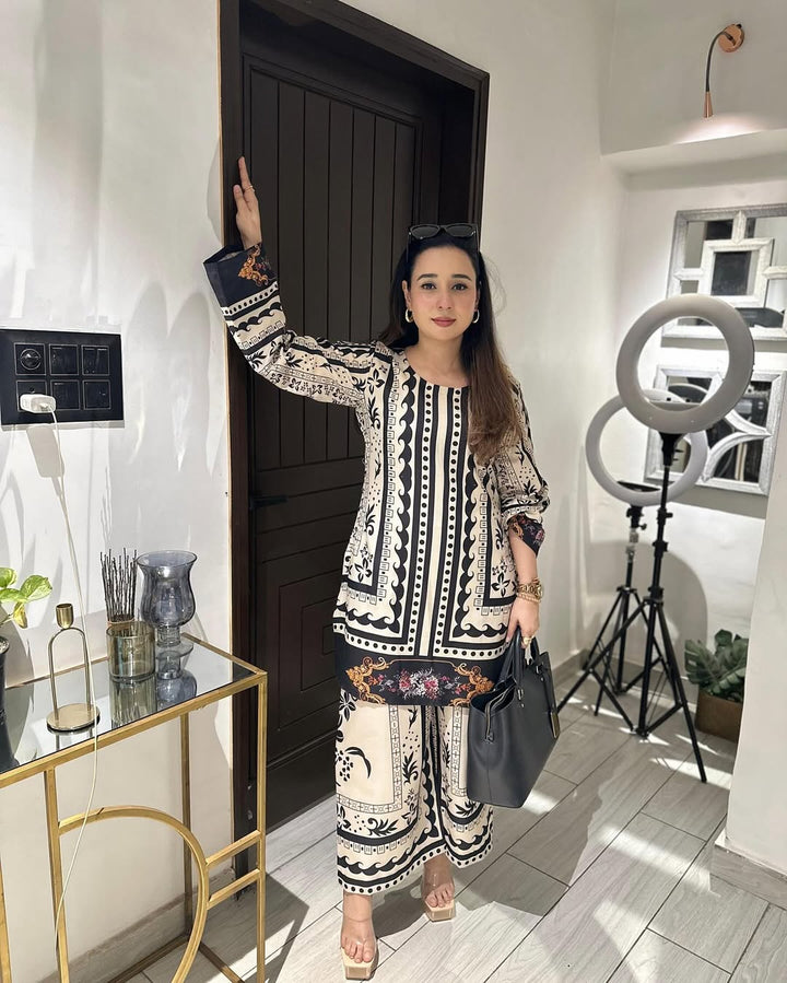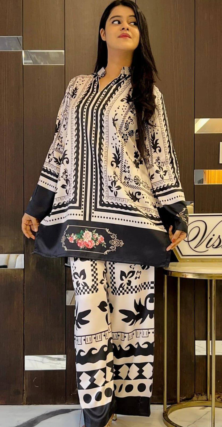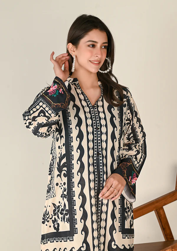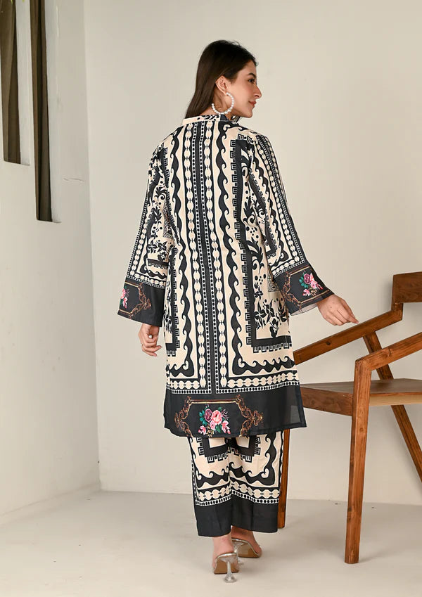 Additional Description: This article is a stylish printed kurti featuring a striking monochrome design. The base color is white, adorned with bold black geometric and wavy patterns running vertically, giving it a sleek and modern look. The neckline is a simple ban-style with a slit front, enhancing its elegance.